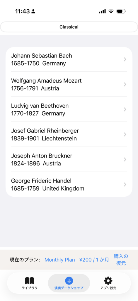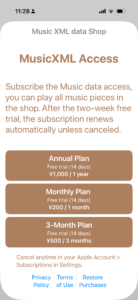 MusicXMLスコアショップへのアクセスにはサブスクリプションが必要です。これよって私どもは継続的なスコア作成とアプリ開発を進められます。